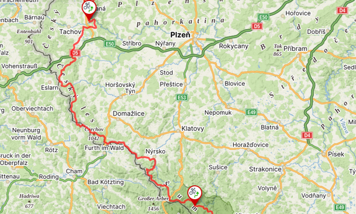 To speed up and save energy, we then include a long 12km section along district roads to village Labuť, after which you will connect to a very comfortable forest asphalt road to town Přimda.