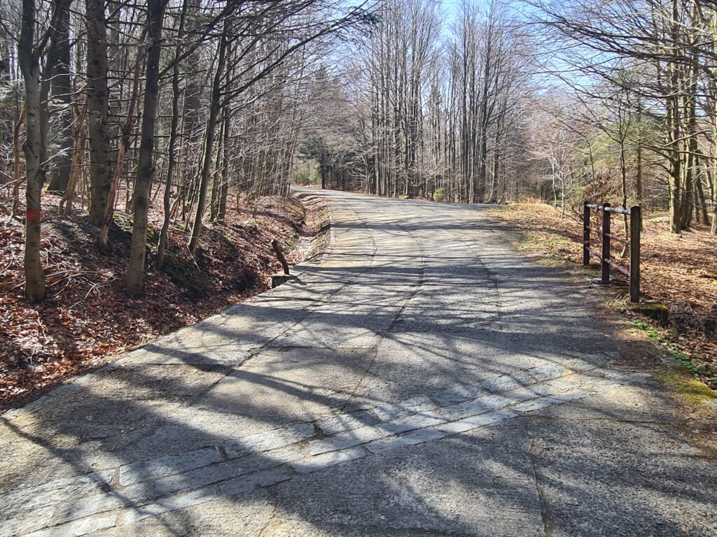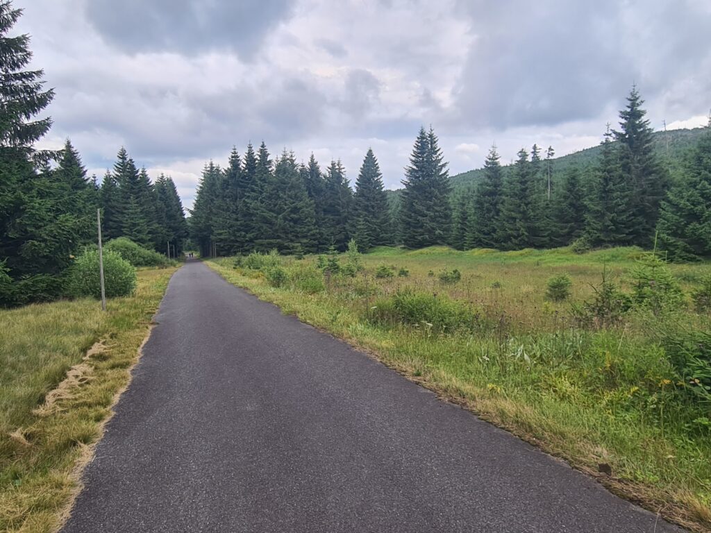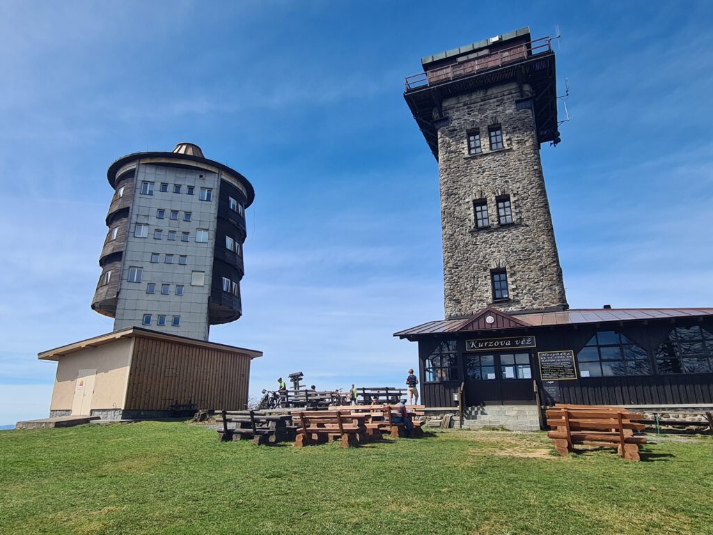 In addition to the views and stone Kurz Tower, your reward will be a gentle descent along a narrow, smooth asphalt road called Horizontála. You will really fly here, so be careful! After several hours in the forests, it is an interesting experience to suddenly emerge in Folmava at the border crossing, on the busy road 26, with lots of trucks, shops, gas stations, etc.