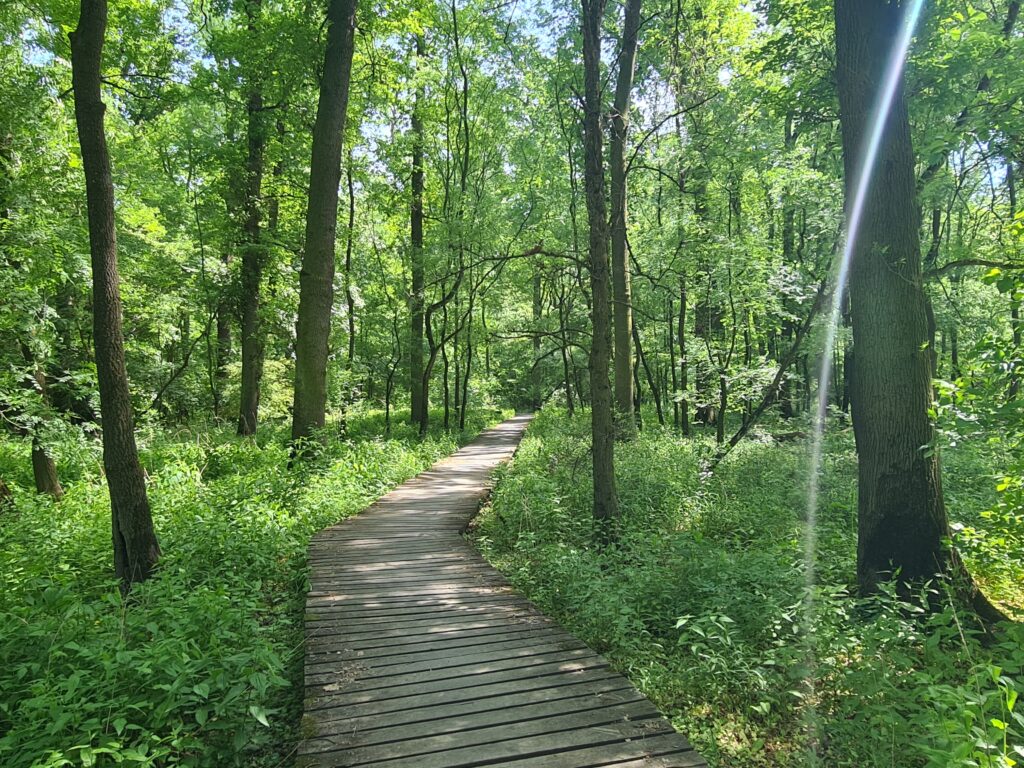 with supersmooth gravel roads between old trees and small lake.