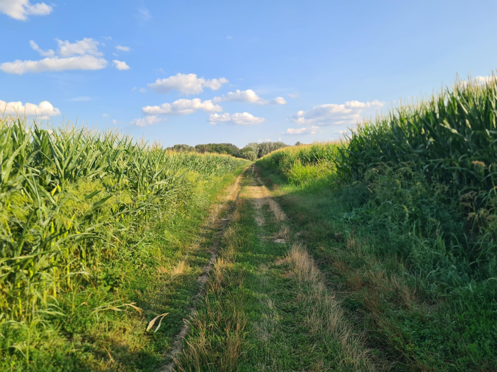 along bumpy and grassy roads between fields of corn. This one has cca 1500m.
